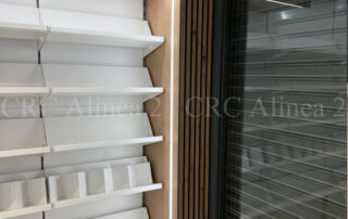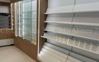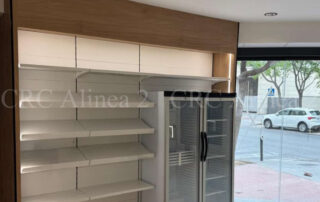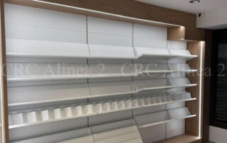 Instalamos un sistema modular de estanterías metálicas autoportantes tras el mostrador, con fondo blanco y estantes regulables para facilitar la exposición de productos. El conjunto se remata con paneles melaminados laterales y superiores, garantizando una imagen cuidada y profesional.Iluminacion led incluida.