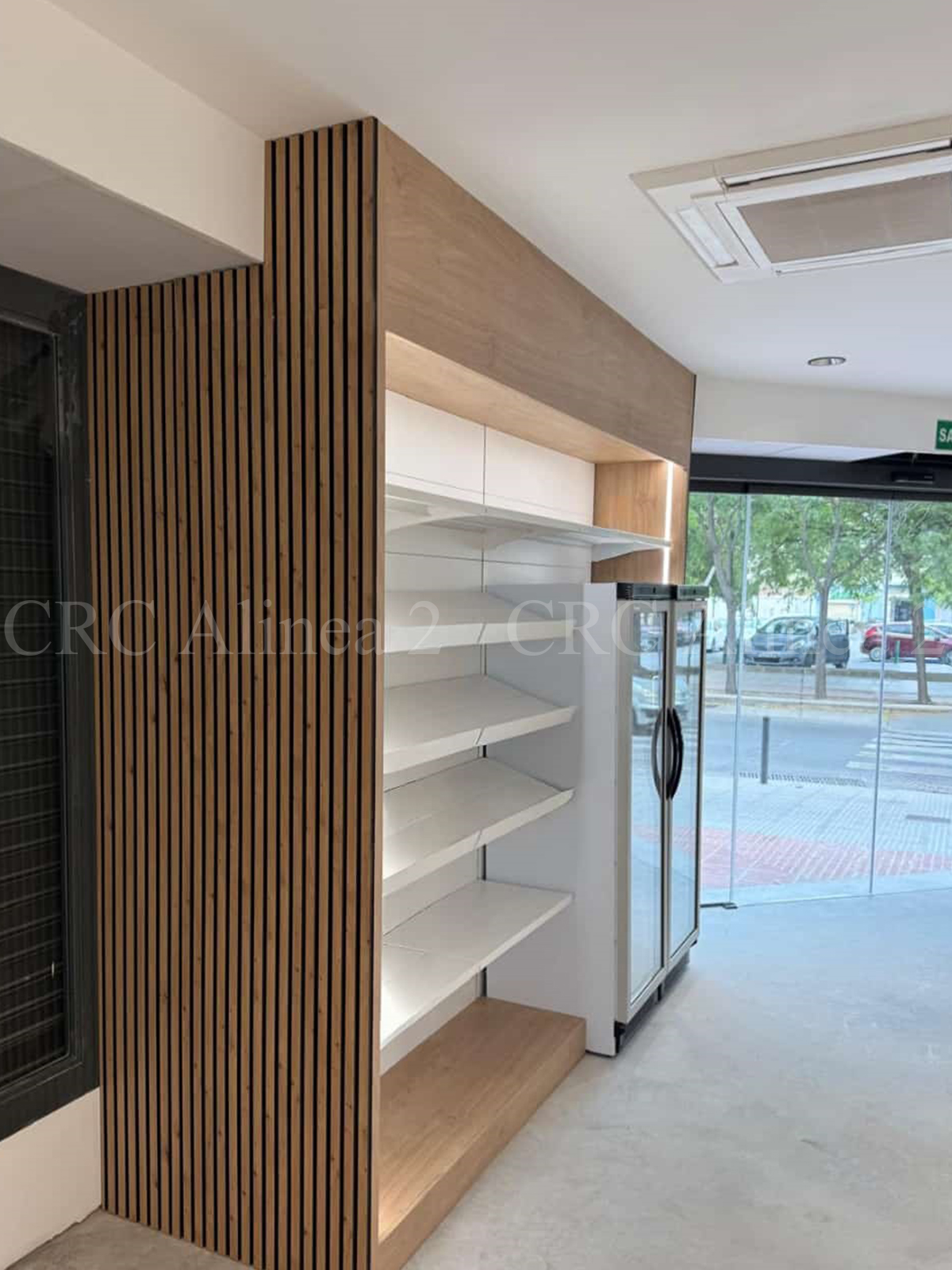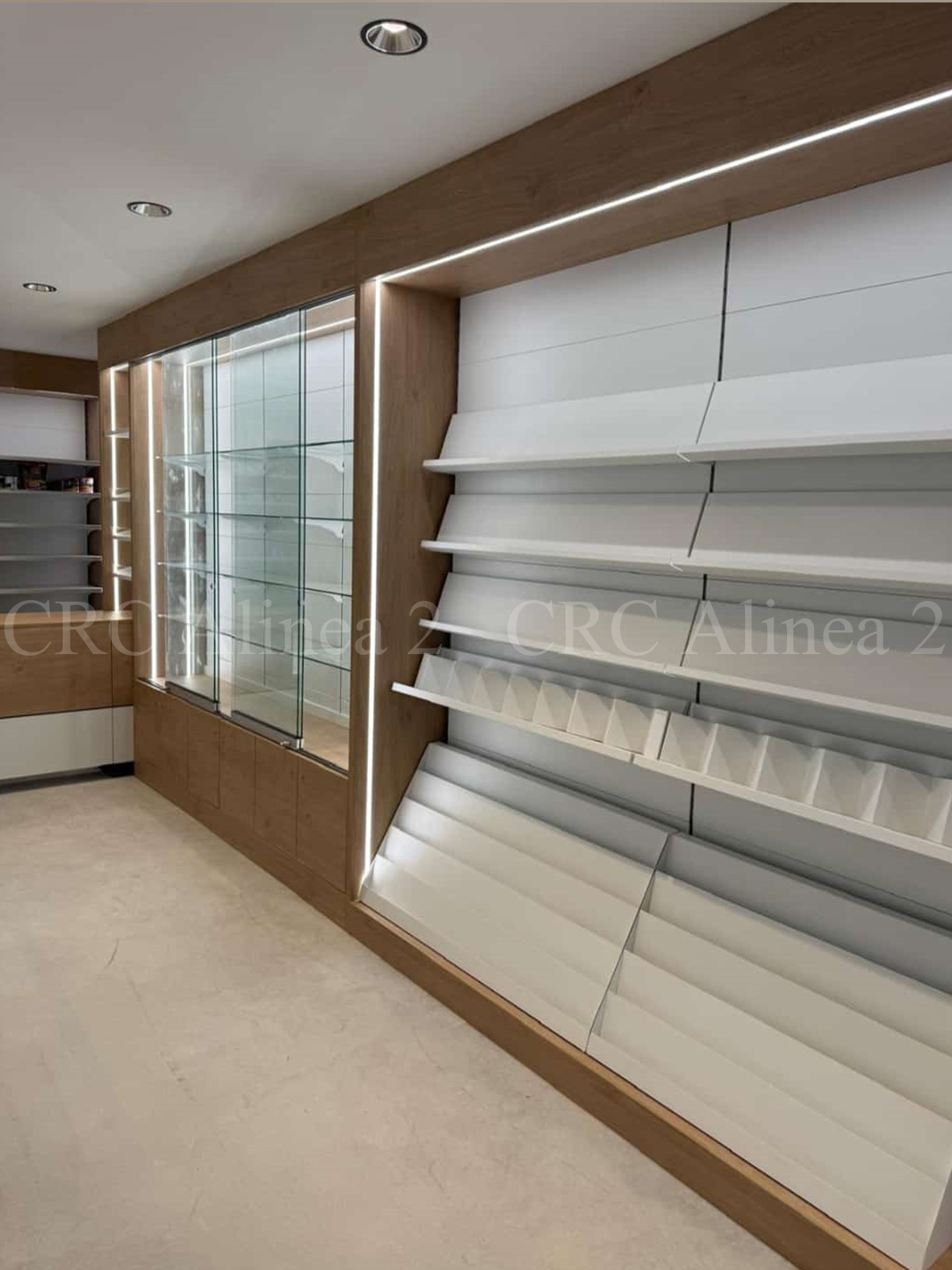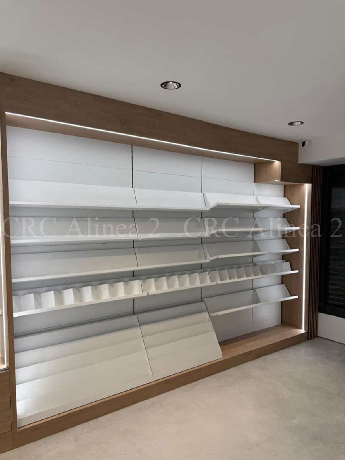 Este espacio está compuesto por estanterías adaptadas con diferentes tipos de expositores, tanto múltiples como simples, algunos inclinados con retenedores. La decoración final incluye panelado listonado para aportar un toque distintivo.  Iluminación led incluida