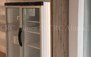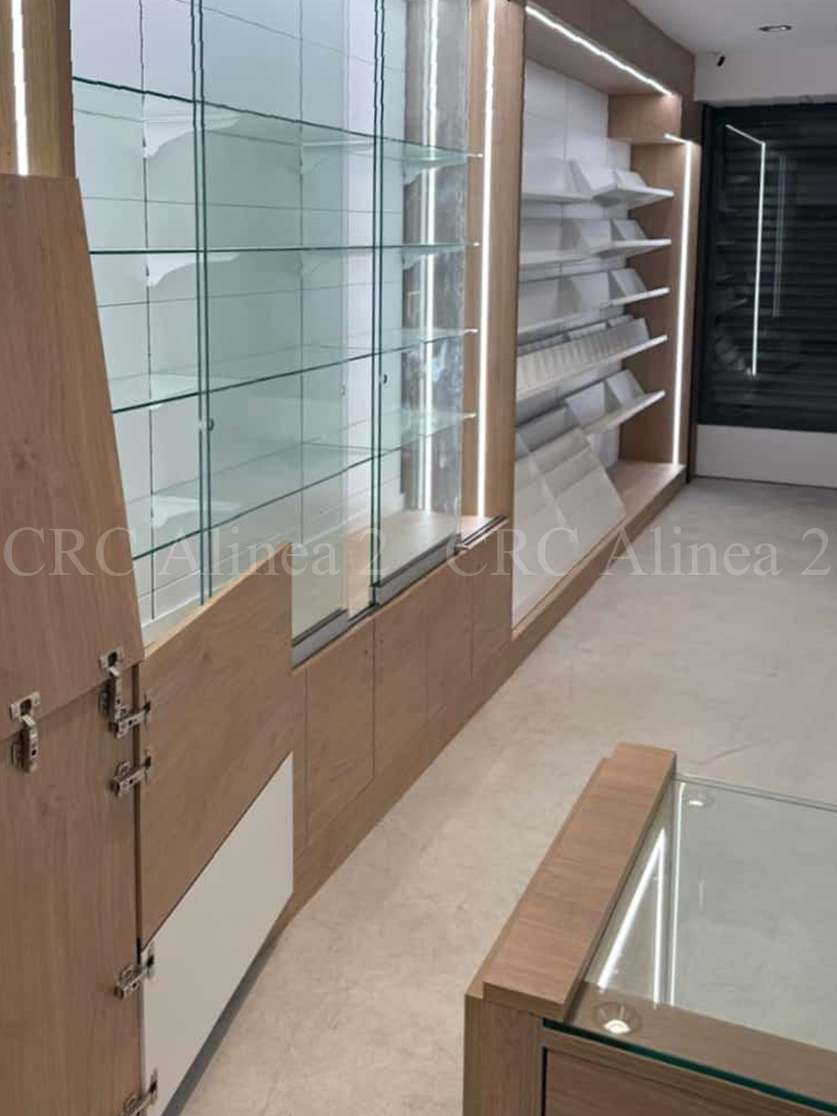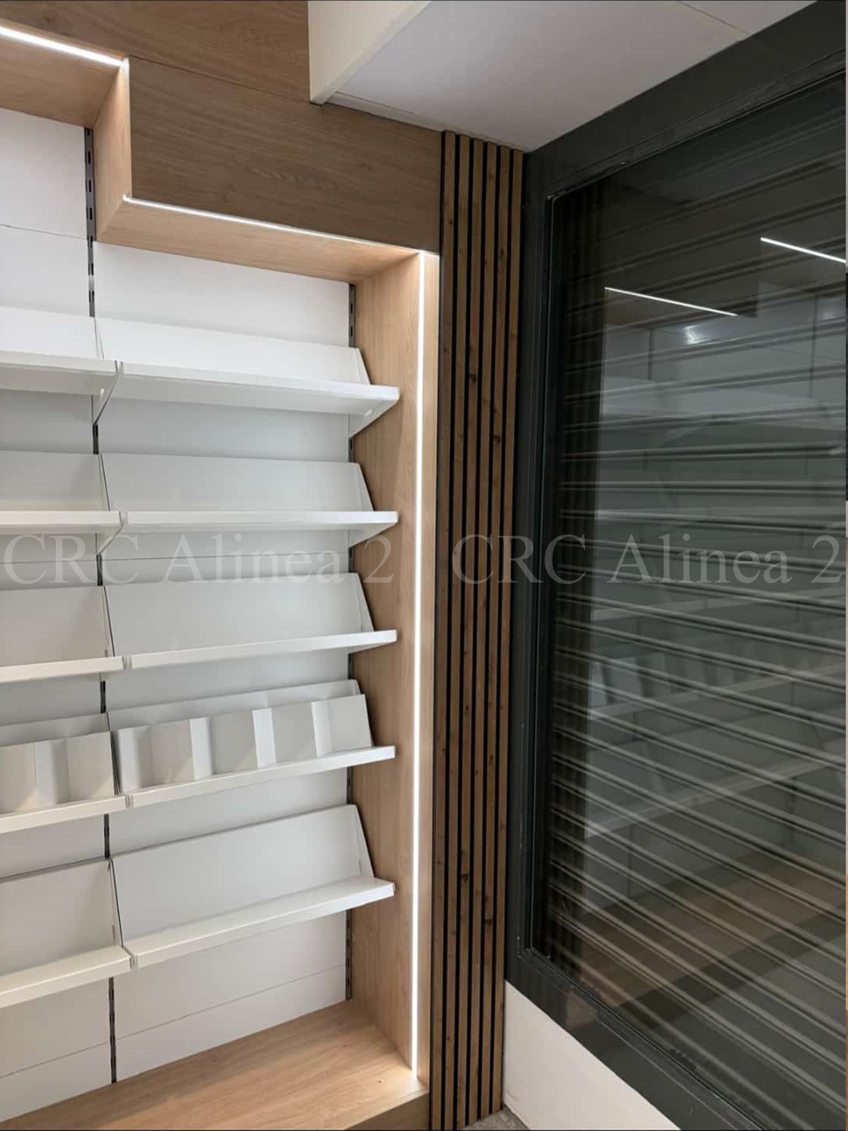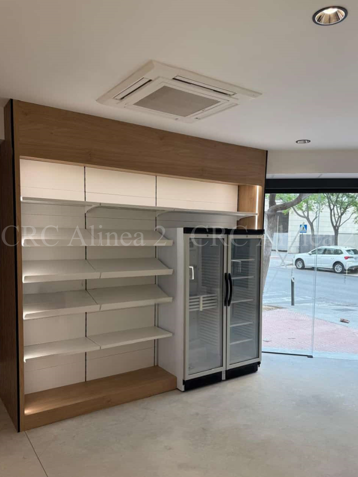 Este espacio está compuesto por estanterías adaptadas con diferentes tipos de expositores, tanto múltiples como simples, algunos inclinados con retenedores. La decoración final incluye panelado listonado para aportar un toque distintivo.  Iluminación led incluida