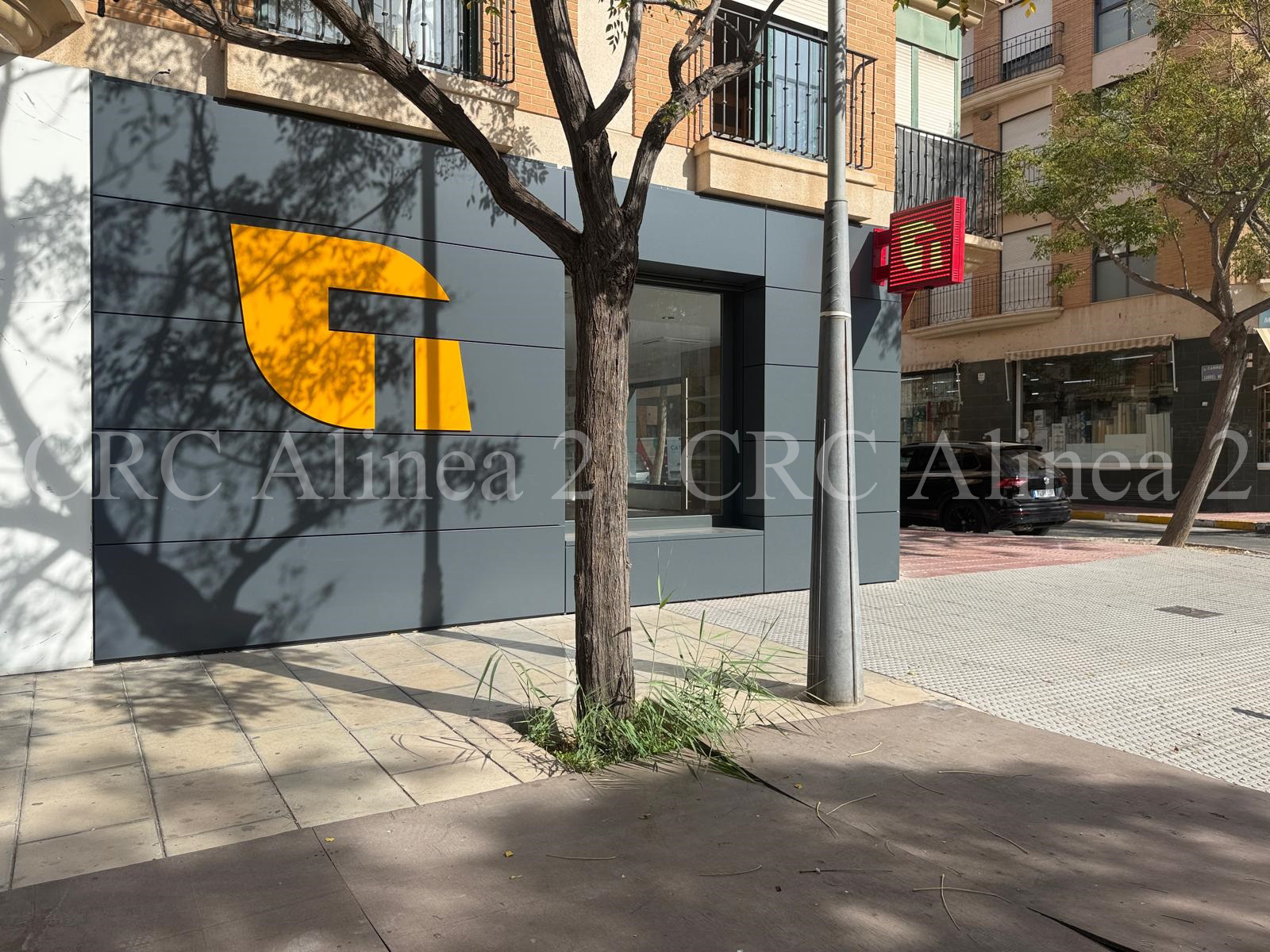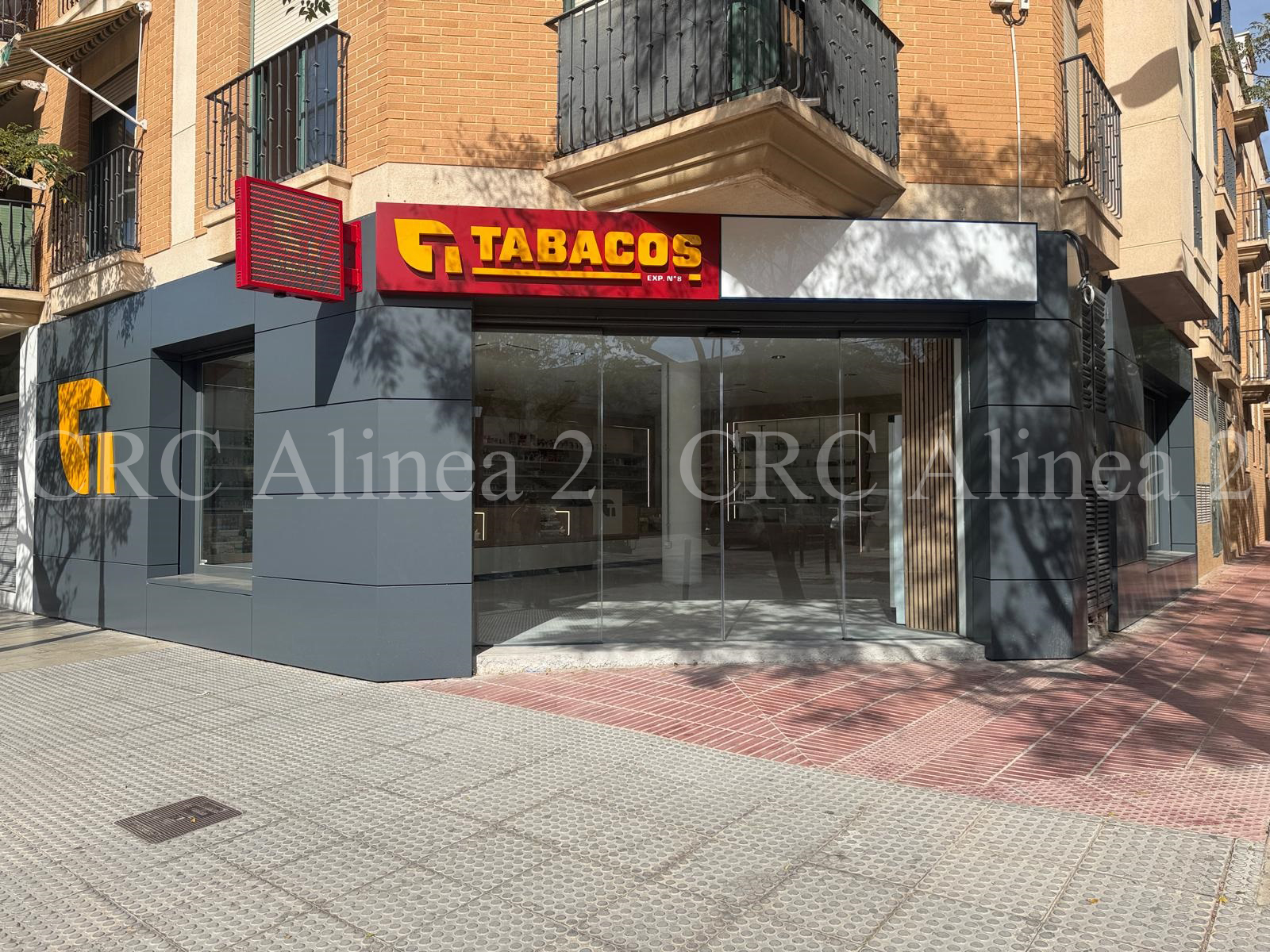 Instalación de una banderola electrónica LED de doble cara para la fachada, con gran visibilidad y alto impacto visual. Un elemento clave para reforzar la presencia del estanco desde el exterior.